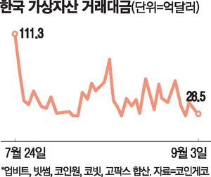 4일 코인게코에 따르면 지난 3일 기준 24시간 국내 5대 가상자산 거래소(업비트, 빗썸, 코인원, 코빗, 고팍스)의 하루 거래대금은 28억4538만달러를 기록했다. 이는 하반기 들어 일 거래대금 최대를 기록했던 지난 7월 24일의 111억2797만달러 대비 74.43% 급감한 수치다.