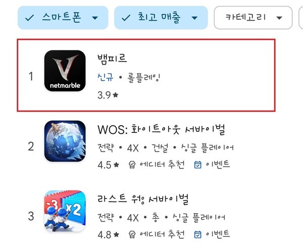 당초 뱀피르는 출시 직후 8시간만에 애플 앱스토어 매출 1위를 기록하며 흥행 파워를 증명했다. 구글 플레이에서는 모바일 게임이 출시되면 약 이틀 뒤 매출 순위가 잡히는 것이 일반적이다. 하지만 출시 일주일이 넘도록 구글 플레이에서는 모습을 보이지 않아 의문이 이어지기도 했다. 업계에선 뱀피르 특유의 높은 PC 매출 외 기술적 이슈로 차트인이 늦어졌던 것으로 추정한다.
