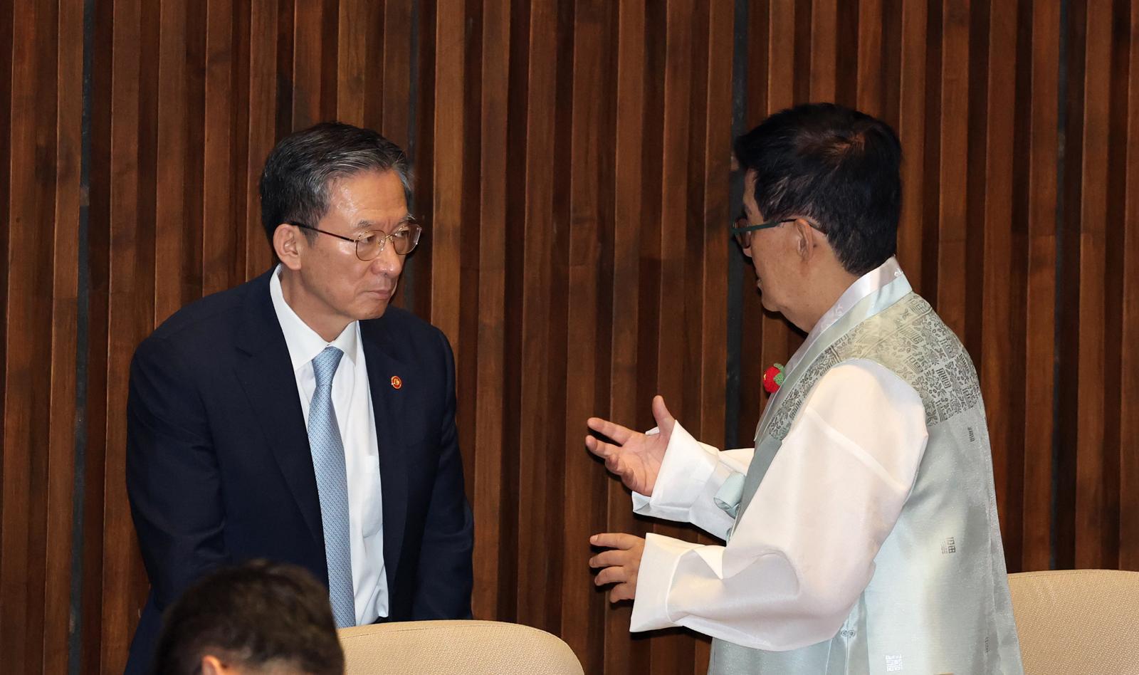박지원 더불어민주당 의원이 1일 오후 서울 여의도 국회에서 열린 제429회 국회(정기회) 개회식에서 정성호 법무부 장관과 대화하고 있다. 2025.9.1/뉴스1 |