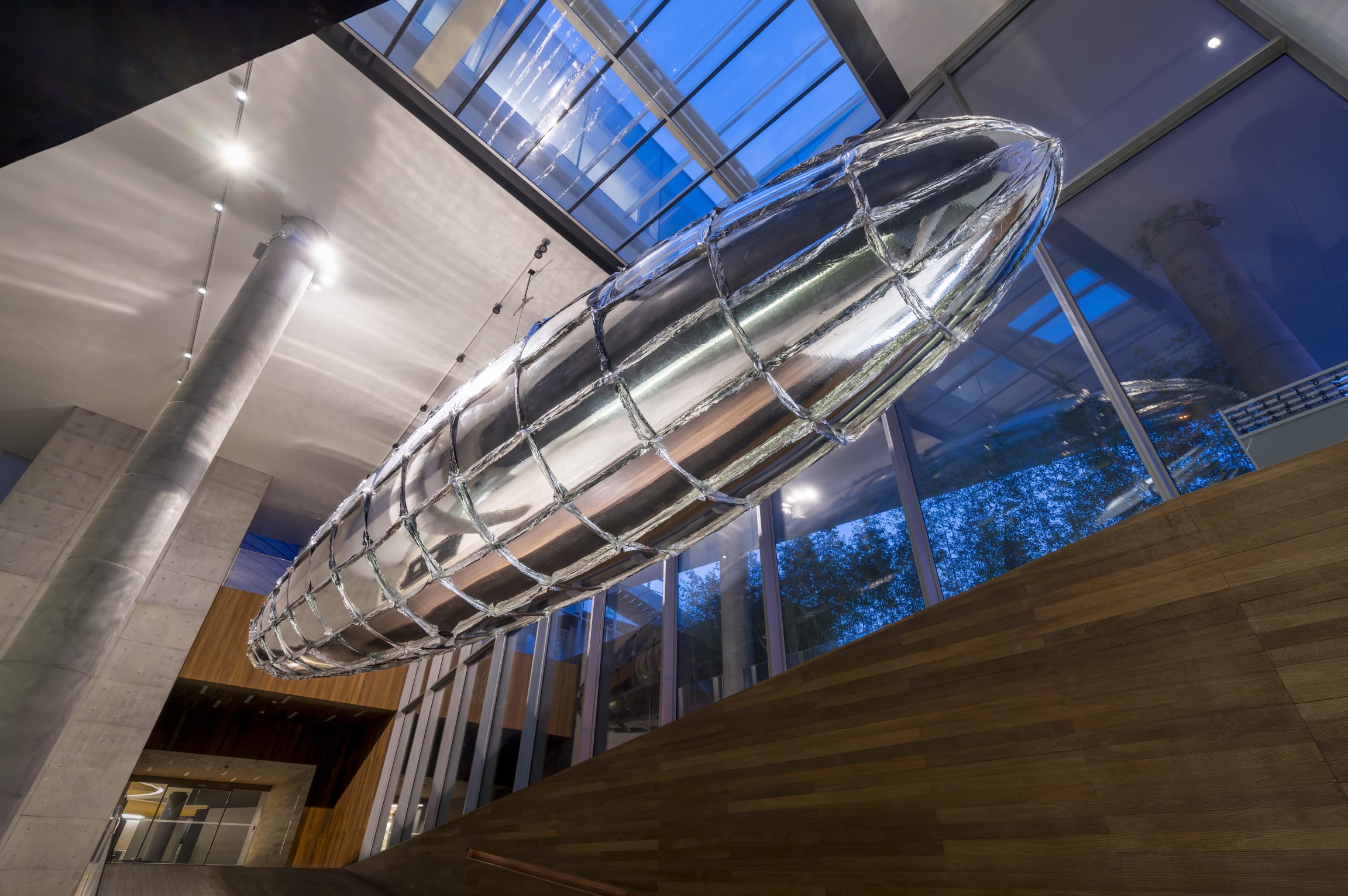 전시장 입구 천장에 17m 길이의 은빛 비행선 ‘취약할 의향-메탈라이즈드 벌룬’이 매달려 있다. 한국 현대미술을 대표하는 작가 이불의 대규모 서베이 전시다. /리움미술관 |