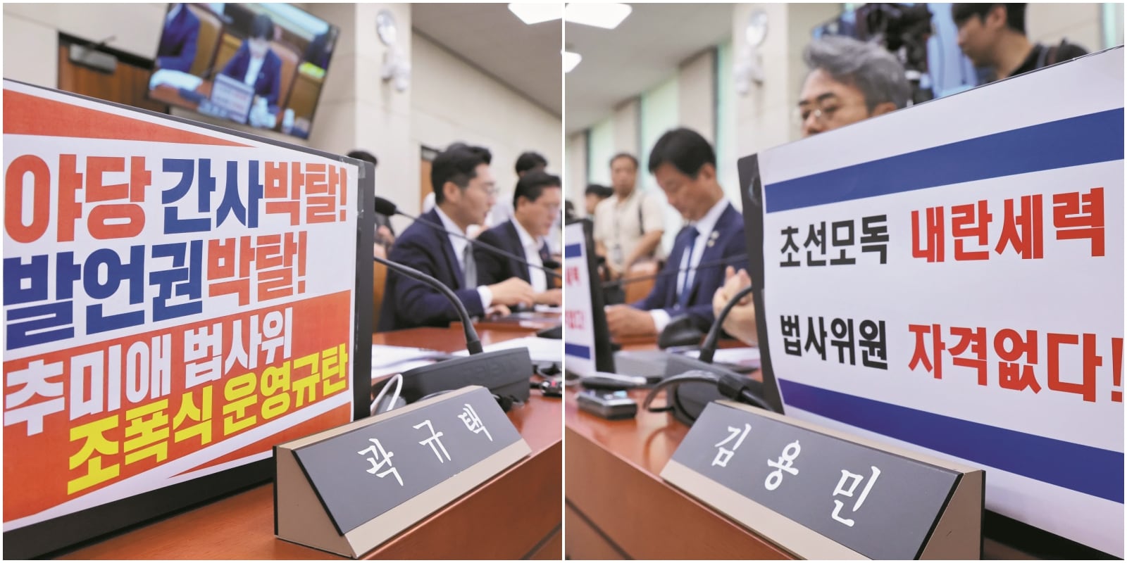 4일 서울 여의도 국회에서 열린 제429회 국회(정기회) 법제사법위원회 제2차 전체회의 '검찰개혁 공청회'에서 국민의힘 위원석과 더불어민주당 위원석 노트북에 각각 상대를 규탄하는 피켓이 붙어 있다./남강호 기자 |
