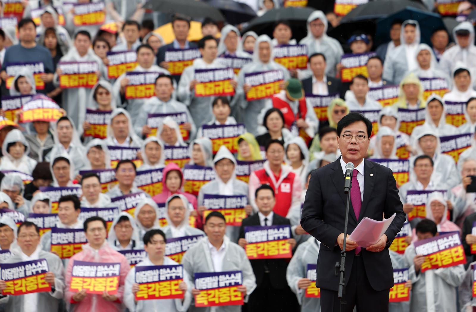 송언석 국민의힘 원내대표가 4일 오전 서울 여의도 국회 본청 앞 계단에서 열린 ‘야당말살 정치탄압 특검수사 규탄대회’에서 연설하고 있다. 2025.09.04. 서울=뉴시스 |