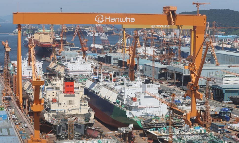 한-미 관세협상 타결의 일등 공신은 우리 정부가 미국 정부에 제안한 조선업 협력 프로젝트 ‘마스가’(MASGA)라고 해도 과언이 아니다. 한화오션 경남 거제 사업장에 건조 중인 선박이 보인다. 연합뉴스 |