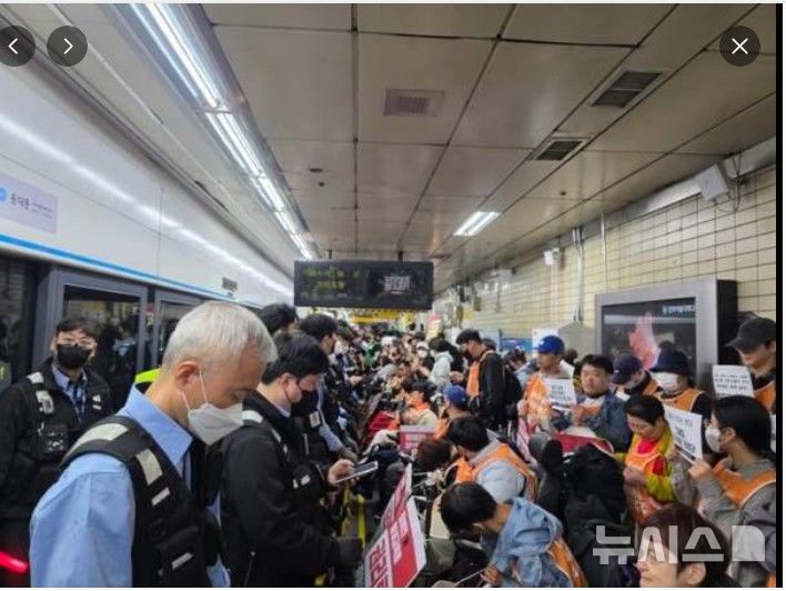 [과천=뉴시스] 박석희 기자 = 전국장애인차별철폐연대(전장연)의 시위로 수도권 지하철 4호선 상행 열차가 지연 운행돼 출근길 시민들이 불편을 겪고 있다.