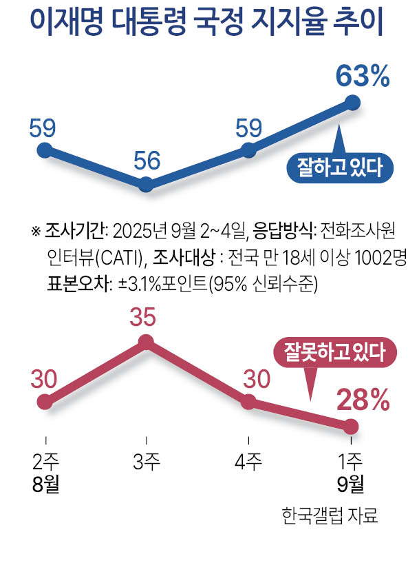 한국갤럽이 지난 2~4일 전 전국 만 18세 이상 유권자 1002명을 대상으로 실시한 조사 결과(9월 1주차 정례 조사)에 따르면 ‘요즘 이재명 대통령이 대통령으로서의 직무를 잘 수행하고 있다고 보는지, 잘못 수행하고 있다고 보는지’에 관한 질문(긍정·부정을 답하지 않은 경우 재질문)에 63%가 ‘잘하고 있다’고 답했다.(신뢰수준 95%, 표본오차 ±3.1%p) 반면 ‘잘못하고 있다’는 응답은 28%로 나타났다. ‘의견 유보’는 9%였다.
