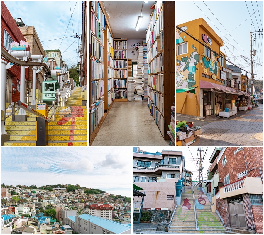 넓은 해변 대신 어제와 오늘이 공존하는 부산의 동네 길을 걷는다. 책방골목부터 가파른 계단, 삶이 녹아있는 시장까지. 바다 없는 부산 여행은 또 다른 깊이를 품고 있다. 왼쪽부터 시계방향으로 닥밭골 소망계단 모노레일, 보수동 책방골목, 웹툰이바구길, 그리고 초량동과 168계단. 사진 김기쁨 작가 |