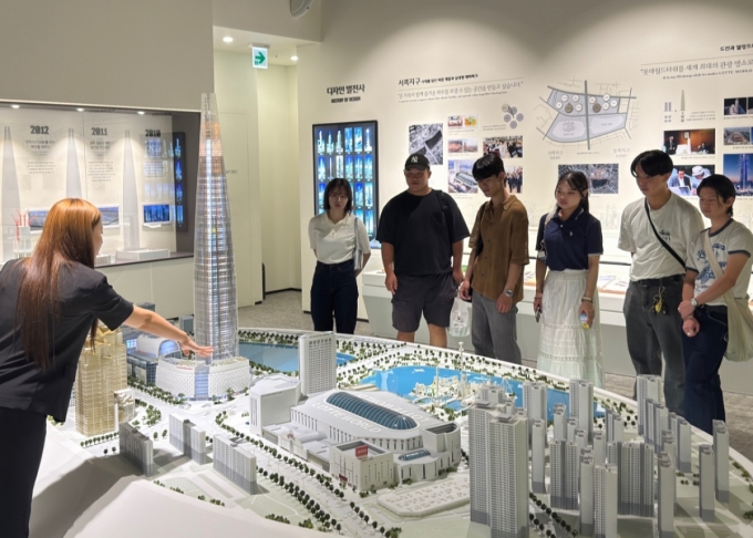 일본 오사카경제대 학생들이 4일 잠실 롯데월드타워를 찾아 신격호 롯데 창업주의 기업가 정신을 배웠다. 신격호 기념관을 방문한 학생들이 롯데월드타워, 롯데월드 어드벤처 등 롯데를 상징하는 건물들에 대한 설명을 듣고 있다. /사진제공=롯데지주. |