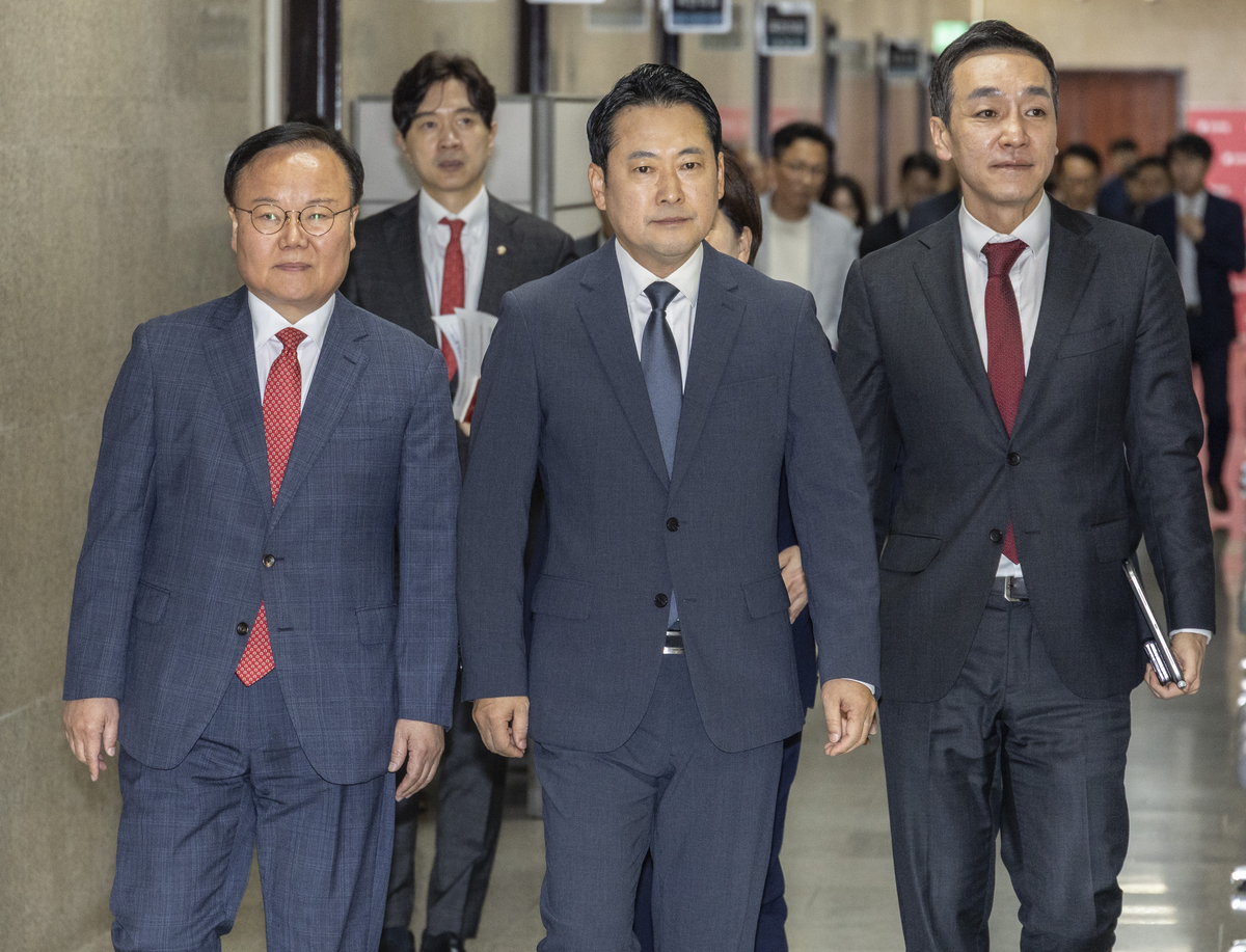 장동혁 국민의힘 대표(가운데)와 김민수(앞줄 오른쪽)·김재원 최고위원(앞줄 왼쪽)이 지난 3일 국회에서 긴급 최고위원회의에 참석하기 위해 이동하고 있다. 연합뉴스 |