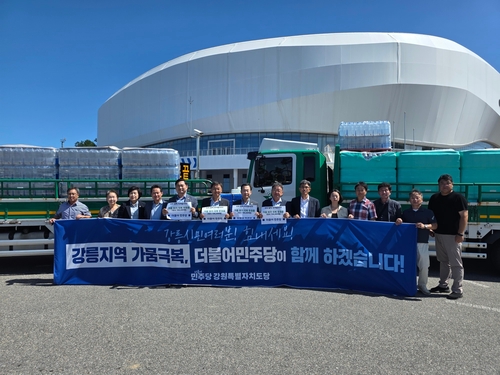 (춘천=연합뉴스) 박영서 기자 = 더불어민주당은 5일 극심한 가뭄을 겪는 강릉에 생수 200t을 전달했다.