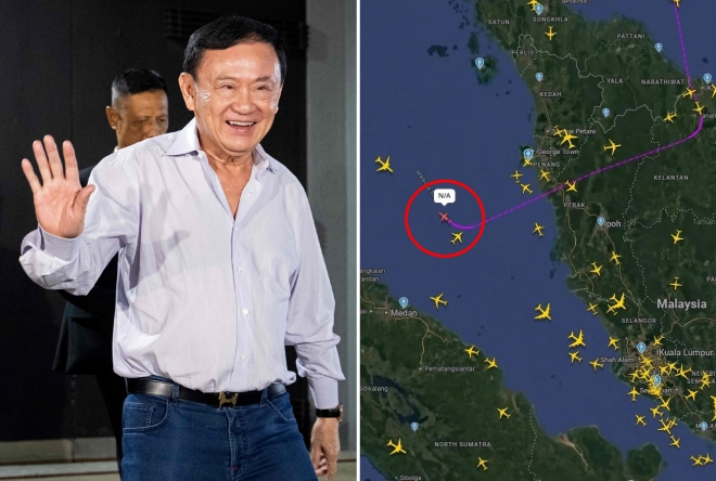 태국 탁신 친나왓 전 총리(왼쪽)가 방콕에서 지지자들에게 손을 흔들고 있다. 오른쪽은 그의 전용기 ‘밤바디어 글로벌 7500’의 비행경로로, 애초 싱가포르로 향하다가 말레이시아 상공에서 급히 선회한 뒤 두바이로 향하는 모습이 비행 추적 데이터에 포착됐다. AFP 연합뉴스·Army Military Force 페이스북 |
