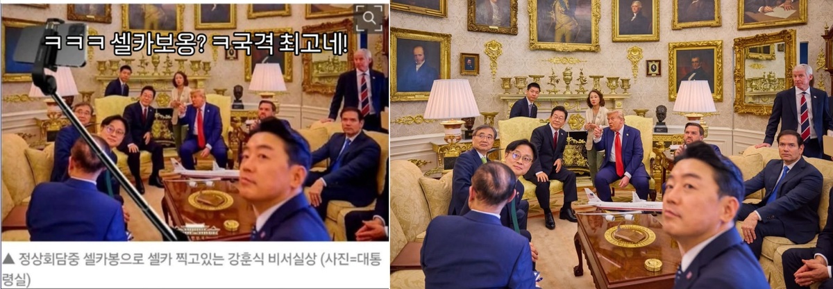 이재명 대통령과 도널드 트럼프 미 대통령의 정상회담 상황이라며 사진 한장이 사회관계망서비스(SNS)에 등장했다. 사진에는 강훈식 대통령 비서실장 옆으로 스마트폰이 달린 셀카봉이 보인다. 방 안의 사람들의 시선이 향한 한 곳이 마치 셀카봉 끝에 있는 스마트폰에 모인 듯하다.