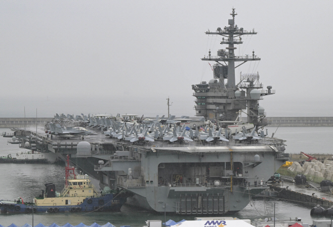 2024년 6월 22일 오전 부산 해군작전기지에 미국 항공모함 시어도어 루즈벨트함이 입항해 모습을 드러내고 있다. 루즈벨트함은 한국·미국·일본의 첫 다영역 군사훈련 '프리덤 에지'에 참여하기 위해 부산으로 들어왔다. /해군작전사 제공 |