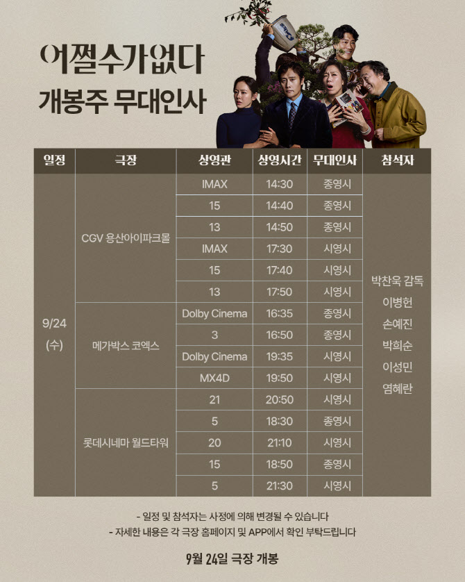 제82회 베니스국제영화제 경쟁 부문 초청작이자 30회 부산국제영화제 개막작인 ‘어쩔수가없다’가 개봉일과 개봉 첫 주말 무대인사를 확정했다