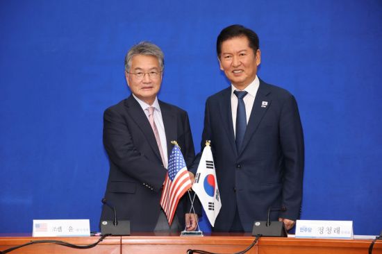 또 정 대표는 "한국 속담에는 멀리 있는 친척보다 이웃사촌이 낫다는 말이 있다"며 "윤 대사대리와 앞으로 멀리 있는 친척보다 이웃사촌처럼 자주 뵀으면 한다"고 했다.