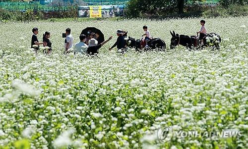 봉평 메밀꽃밭서 당나귀 타기 체험 |