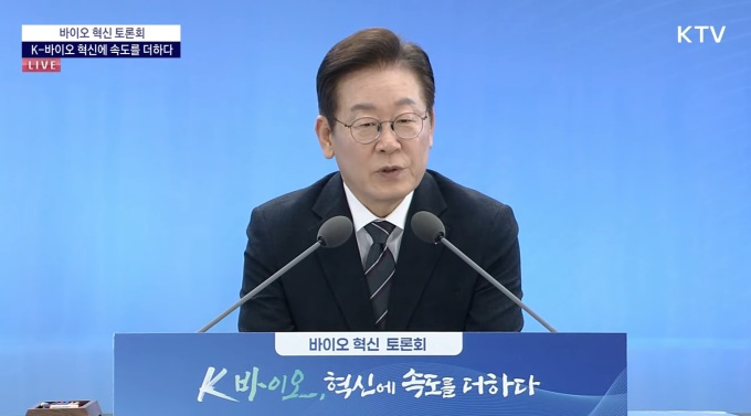이재명 대통령이 5일 오후 인천 송도컨벤시아에서 열린 'K-바이오, 혁신에 속도를 더하다'라는 주제의 바이오 혁신 토론회에서 모두발언하고 있다. [사진=KTV] |