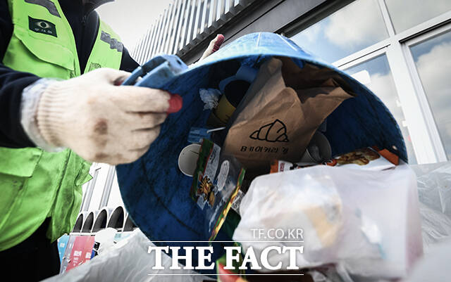 환경미화원이 분리수거가 안 된 쓰레기통을 비우고 있는 모습. / 본사 DB |