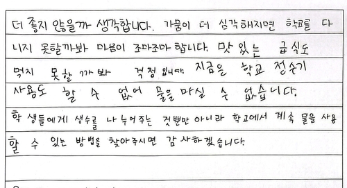이들은 "대통령님은 현명하게 문제를 잘 해결해줄 것 같다"며 "가뭄으로 우리가 겪는 힘든 일과 고민을 적었으니 나랏일로 바쁘시겠지만 읽어주시면 감사하겠다"고 편지를 시작했다.