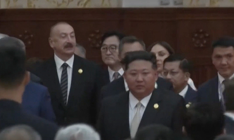중국 정부의 공식 초청으로 제80주년 중국 전승절 열병식 및 환영 리셉션 오찬에 참석한 우원식 국회의장이 지난 3일 베이징 톈안먼 망루(성루)에서 열병식을 참관하기 전 대기실에서 북한 김정은 국무위원장과 수인사를 나눴다고 국회의장실이 전했다. 사진은 이날 리셉션 장소로 추정되는 곳에서의 우원식 국회의장과 김정은 국무위원장의 모습. 연합뉴스 |