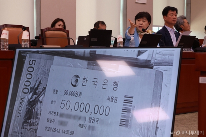 [서울=뉴시스] 김명년 기자 = 서영교 더불어민주당 의원이 5일 서울 여의도 국회에서 열린 법제사법위원회 검찰개혁 입법청문회에서 증인으로 출석한 김정민 서울남부지방검찰청 수사관에게 관봉권 띠지 분실 관련 질의를 하고 있다. 2025.09.05. kmn@newsis.com /사진=김명년 |