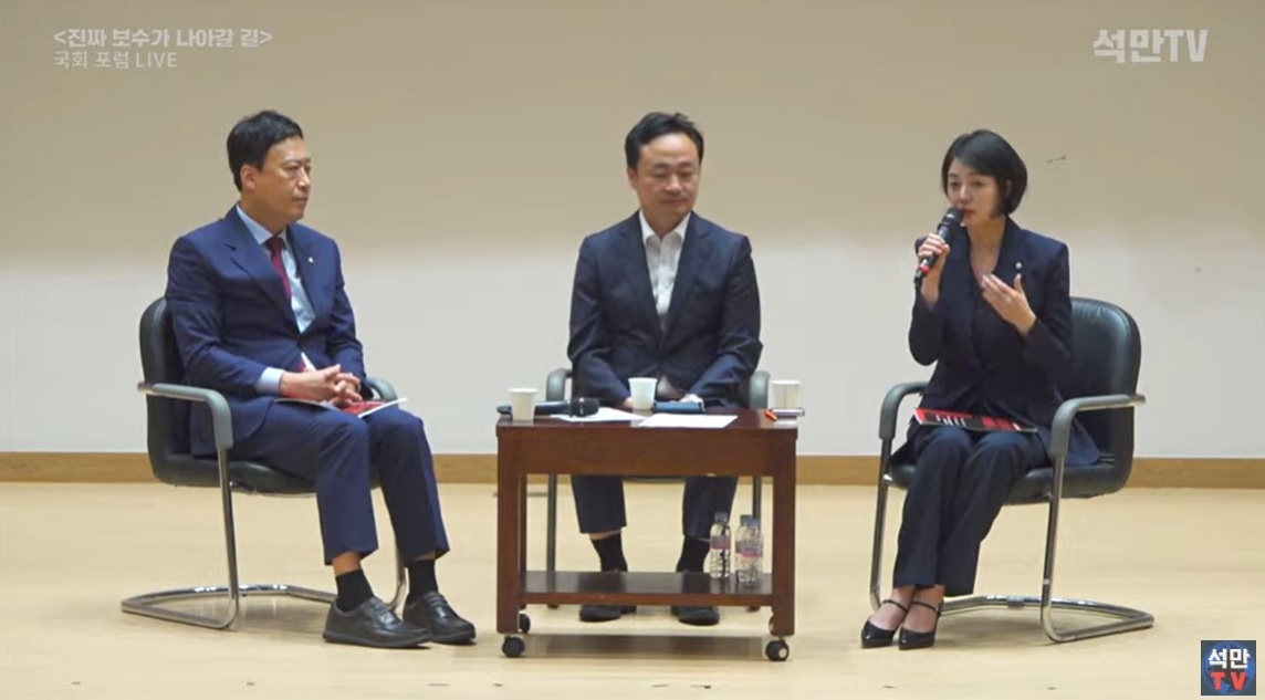 ‘진짜 보수가 나아갈 길’ 포럼에서 대담을 나누는 (왼쪽부터) 정성국 국민의힘 의원과 윤석만 전 중앙일보 논설위원, 배현진 국민의힘 의원 [유튜브 생중계 캡처] |