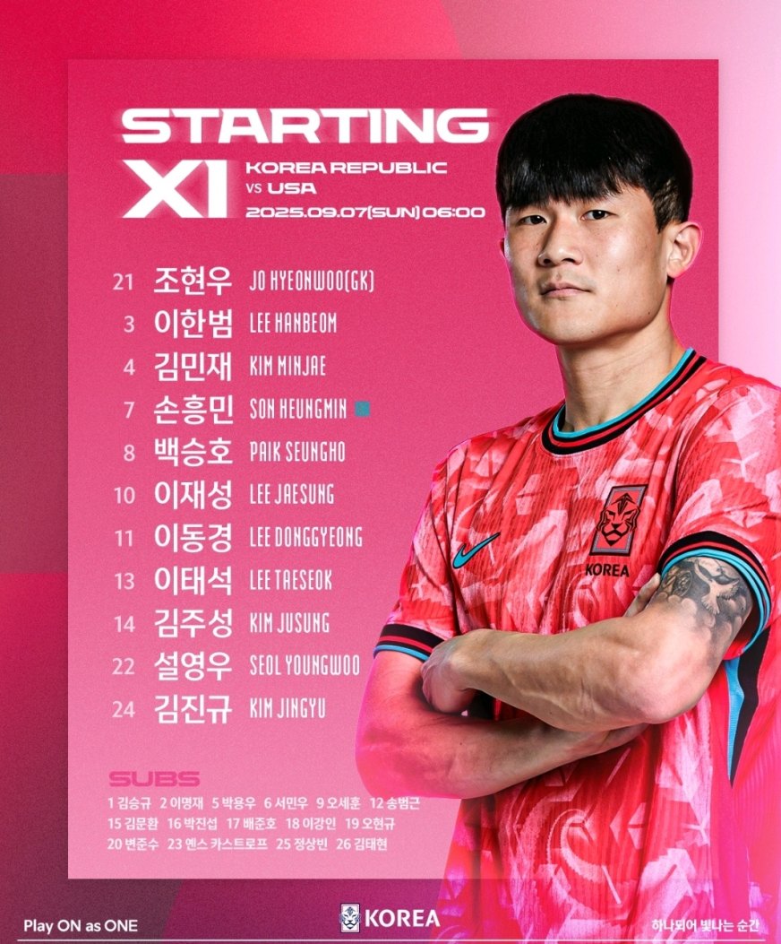 홍명보 감독이 이끄는 대한민국 축구 국가대표팀은 7일(한국시간) 오전 6시 미국 뉴저지주 해리슨에 위치한 스포츠 일러스트레이티드 스타디움에서 열리는 미국과의 평가전을 앞두고 선발 명단을 공개했다.