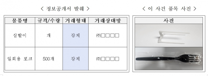 피자앤컴퍼니는 정보공개서에 '피자 고정용 삼발이'(2019년 4월~2023년 4월)와 '일회용 포크'(2022년 4월~2023년 4월)를 각각 필수품목으로 지정했다. 이후 가맹점주에 가맹본부 또는 지정된 물류업체로부터만 구매하도록 강제했다.