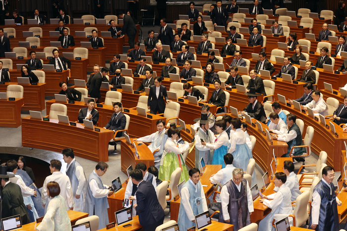 한복과 상복 (서울=연합뉴스) 박동주 기자 = 1일 서울 여의도 국회에서 열린 정기국회 개회식에 앞서 한복과 상복을 입은 여야 의원들이 참석해 있다. 2025.9.1 pdj6635@yna.co.kr (끝) |