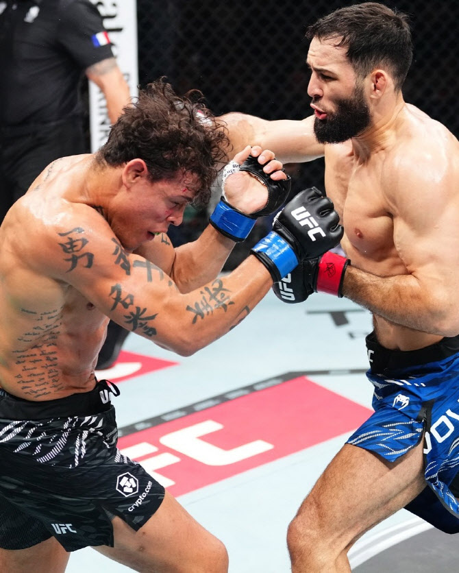 나수르딘 이마보프(오른쪽)이 카이우 보할류를 타격으로 몰아붙이고 있다. 사진=UFC |