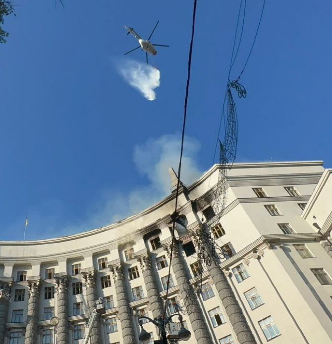 로이터통신에 따르면 율리아 스비리덴코 우크라이나 총리는 이날 텔레그램을 통해 “처음으로 정부 청사가 적(러시아)의 공격으로 지붕과 상층이 피해를 입었다”며 “구조대원들이 화재를 진압하고 있다”고 밝혔다. 우크라이나 정부청사는 키이우 도심 중심에 위치해 있다.