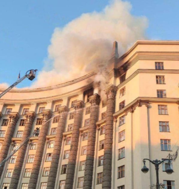 스비리덴코 총리가 텔레그램에서 공개한 사진에는 정부청사 건물 상층부에서 창문을 통해 붉은 화염과 연기가 솟아오르는 모습이 담겼다. 소방 헬기와 소방대원 등이 화재를 진압하는 장면도 포착됐다.