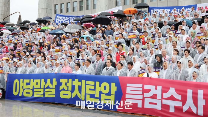 장동혁 국민의힘 대표를 비롯한 의원·당원들이 4일 서울 여의도 국회 본청 계단에서 열린 야당말살 정치탄압 특검수사 규탄대회에 참석해 구호를 외치고 있다. [한주형 기자] |