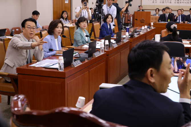 5일 서울 여의도 국회에서 열린 법제사법위원회 검찰 개혁 입법청문회에서 국민의힘 간사 곽규택 의원과 나경원 의원 등 법사위원들이 증인채택 등에 항의하고 있다. (사진 = 연합뉴스) |