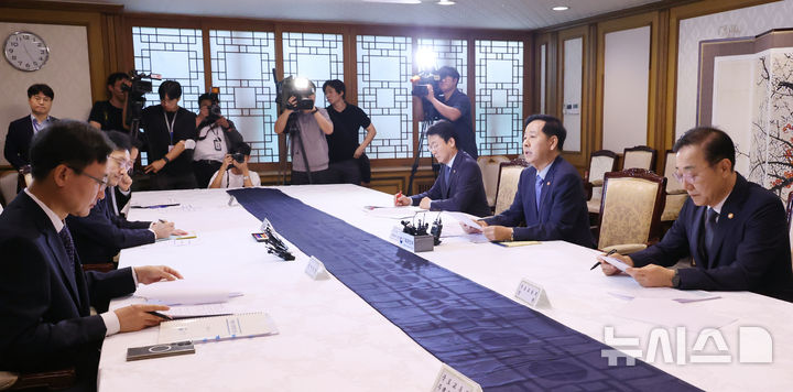 [서울=뉴시스] 김명원 기자 = 구윤철 경제부총리 겸 기획재정부 장관, 윤창렬 국무조정실장, 김윤덕 국토교통부 장관, 권대영 금융위 부위원장, 임광현 국세청장이 7일 오전 서울 종로구 정부서울청사에서 열린 부동산관계장관회의를 하고 있다. 2025.09.07. kmx1105@newsis.com |
