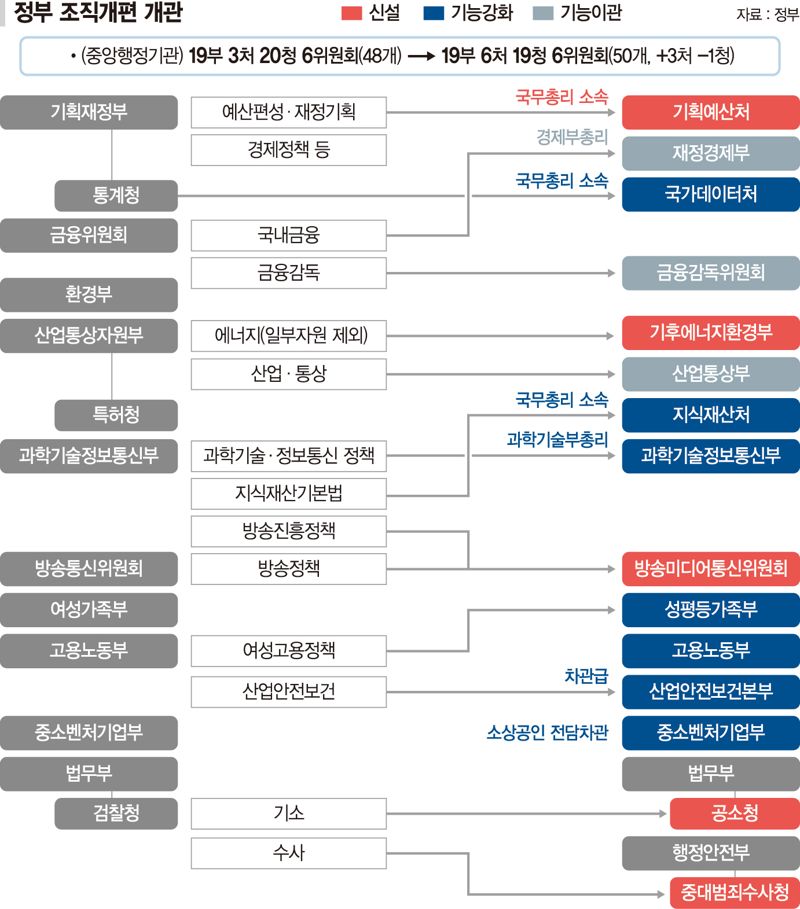 당정은 중소벤처기업부에 소상공인 정책을 전담하는 제2차관을 신설하고, 고용노동부의 산업안전보건 정책을 전담하는 산업안전보건본부를 차관급으로 격상한다. 또 당정은 통계청을 국무총리 소속 국가데이터처로, 특허청은 지식재산처로 각각 격상키로 했다. 여성가족부는 성평등가족부로 확대 개편하고, 성평등 정책 전담기구도 실 단위로 격상한다.
