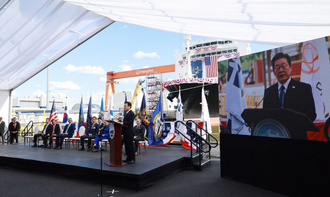 이재명 대통령이 지난 달 26일(현지시간) 미국 필라델피아의 한화 필리조선소에서 미 해양청이 발주한 ‘스테이트 오브 메인’호 명명식 축사를 하고 있다. (사진=연합뉴스) |