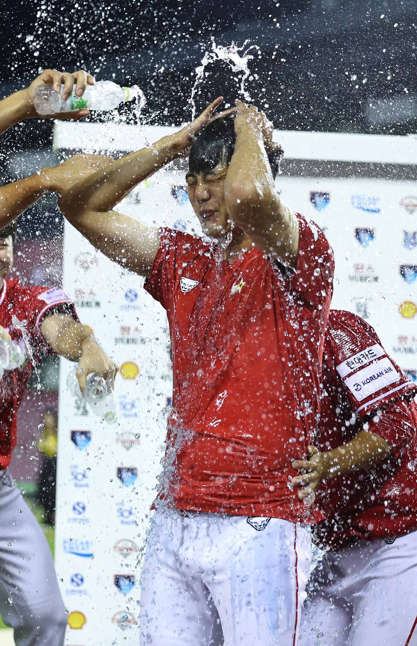 SSG 김광현이 7일 LG전에서 통산 2000탈삼진 기록 달성과 동시에 5이닝 3실점으로 승리를 이끈 뒤 동료들에게 축하 물세례를 받고 있다. 뉴시스 |
