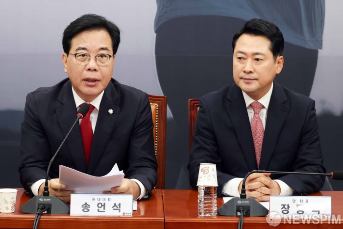 [서울=뉴스핌] 윤창빈 기자 = 송언석 국민의힘 원내대표가 8일 오전 서울 여의도 국회에서 열린 최고위원회의에서 모두발언을 하고 있다. 2025.09.08 pangbin@newspim.com |