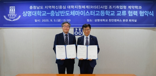 (천안=연합뉴스) 유의주 기자 = 상명대는 충남반도체마이스터고와 지역 기업 성장과 지역인재 정착을 위한 계약학과 활성화를 위한 업무협약(MOU)을 맺었다고 8일 밝혔다.