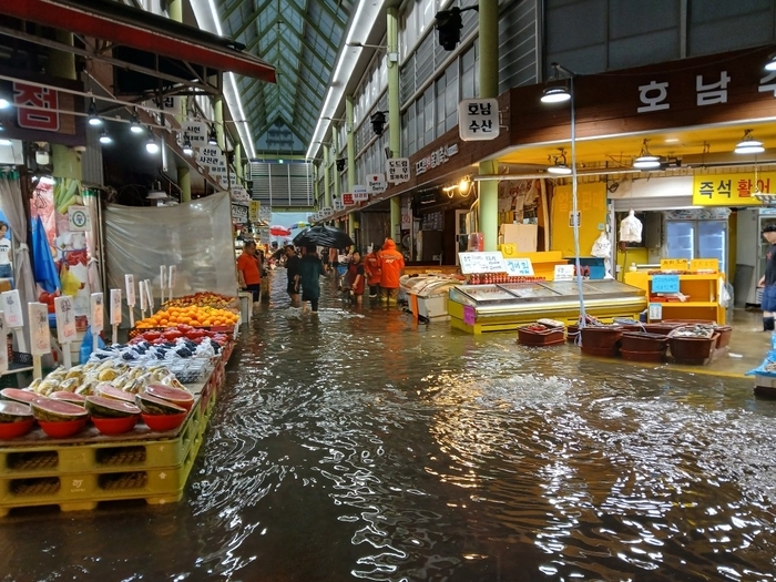 지난 8월 13일 집중호우로 서구 정서진 중앙시장이 침수됐다. 인천시 소방본부 제공 |