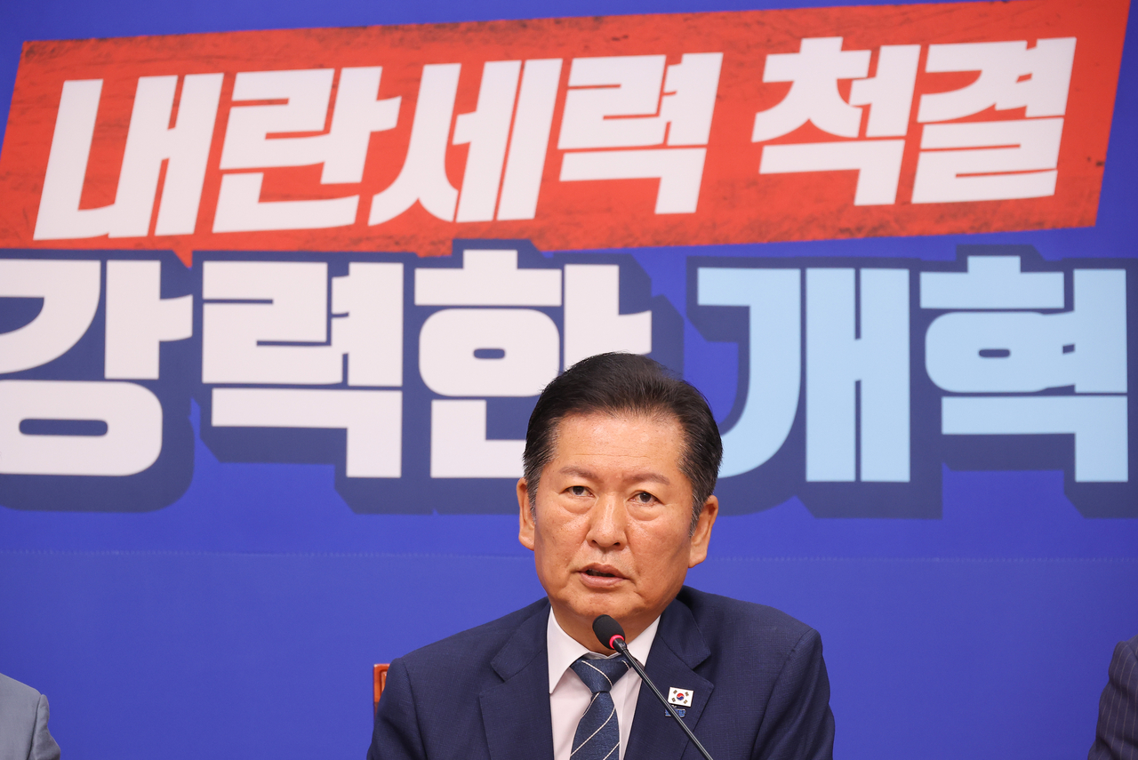 정청래 더불어민주당 대표가 8일 서울 여의도 국회에서 열린 최고위원회의에서 발언하고 있다. [연합] |