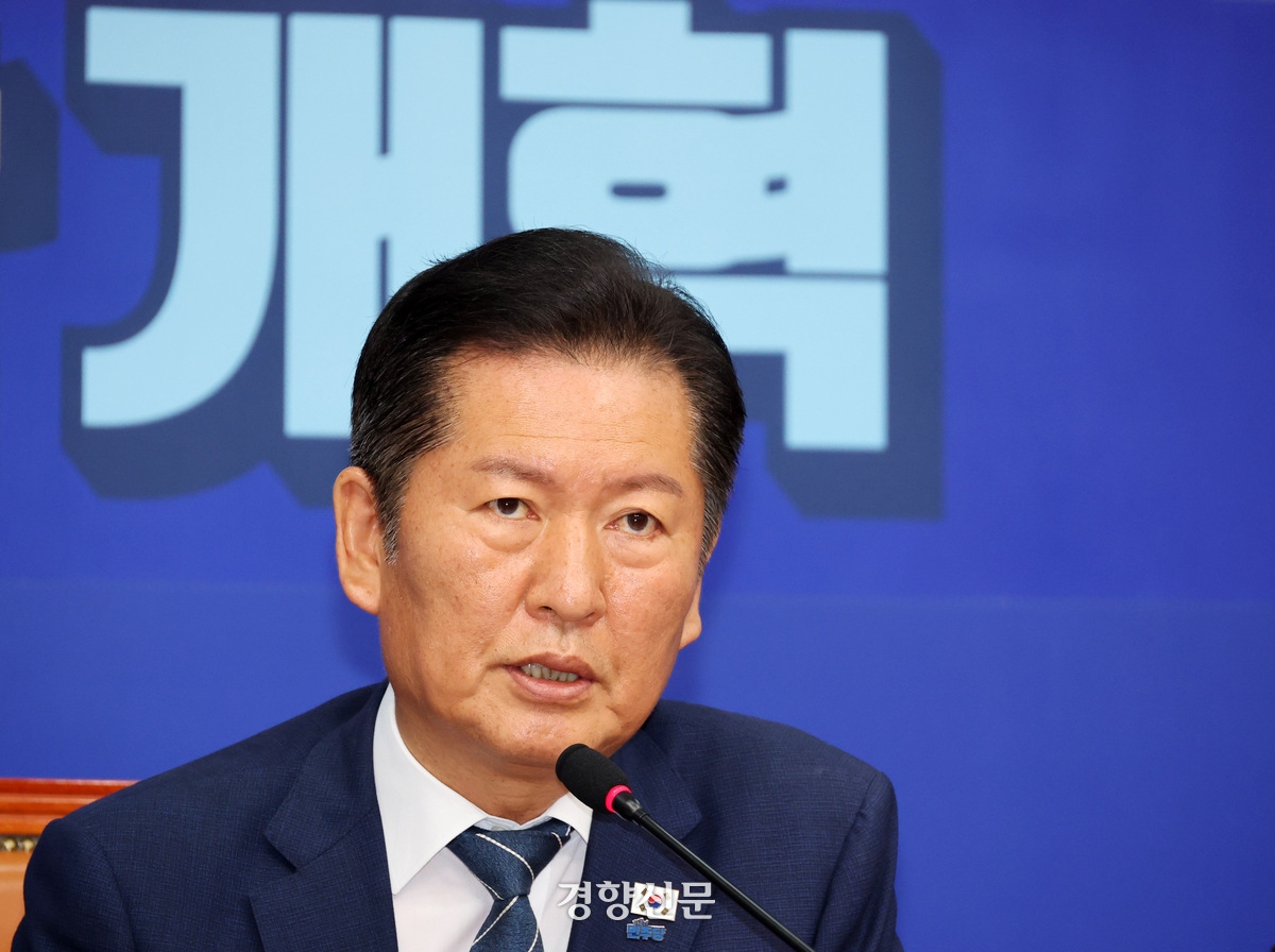 정청래 더불어민주당 대표가 8일 국회에서 열린 민주당 최고위원회의에서 발언하고 있다. 박민규 선임기자 |