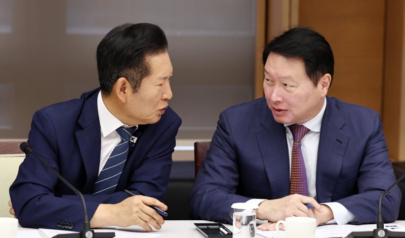 정청래 더불어민주당 대표와 최태원 대한상공회의소 회장이 8일 서울 중구 대한상의에서 열린 정책 간담회에서 대화하고 있다. 뉴스1 |