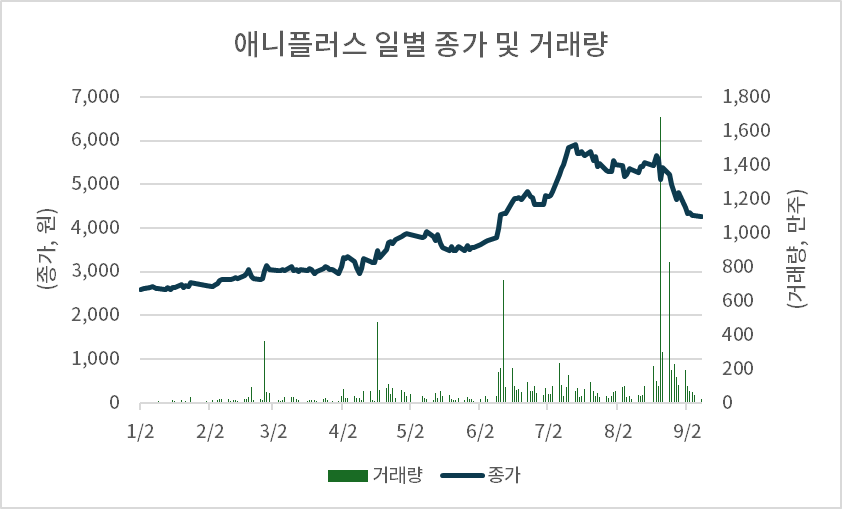 배급사 애니맥스브로드캐스팅코리아 모회사 애니플러스는 9월 8일 오전 장중 4,255원으로 전 거래일보다 소폭 내렸다. 오전 11시 기준 거래량은 19만5천주다.