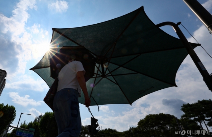 강남·서초·강동·송파구 등 서울 동남권에 폭염경보가 발효된 25일 오후 서울 송파구 석촌호수 사거리에서 양산을 쓴 시민들이 발걸음을 옮기고 있다. /사진=뉴시스 |