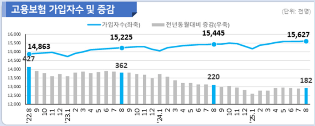 고용보험 가입자가 8월에도 18만명가량 늘며 완만한 증가세를 이어갔다. 서비스업 가입자는 늘었지만, 제조업과 건설업은 여전히 감소세를 벗어나지 못하고 있다.