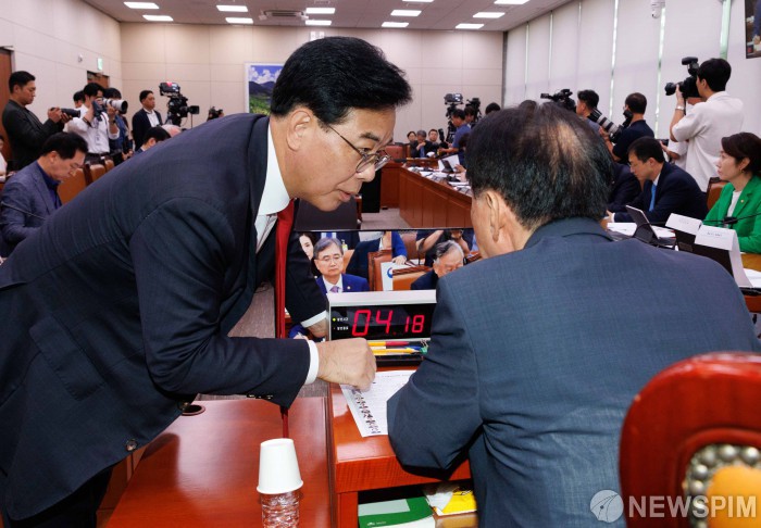 [서울=뉴스핌] 윤창빈 기자 = 김석기 국회 외교통일위원장, 송언석 국민의힘 원내대표가 8일 오후 서울 여의도 국회 외교통일위원회에서 열린 미국 조지아주 한국인 구금사태 관련 긴급현안질의에서 대화를 나누고 있다. 2025.09.08 pangbin@newspim.com