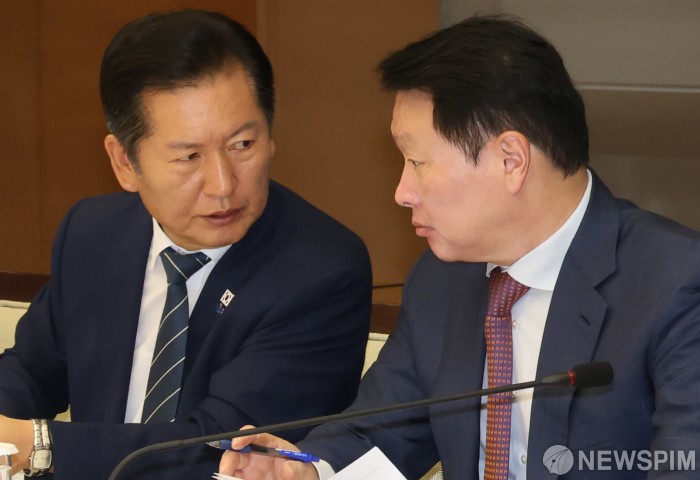 [서울=뉴스핌] 양윤모 기자 = 정청래 더불어민주당 대표와 최태원 대한상공회의소 회장이 8일 오전 서울 중구 대한상공회의소 챔버라운지에서 개최된 더불어민주당- 대한상공회의소 정책간담회에 참석해 대화를 하고 있다. 민주당에서는 이언주 최고위원, 한정애 정책위의장, 유동수 정책위 경제수석부의장, 강준현·정태호·김원이 의원 등이 참석했다. 2025.09.08 yym58@newspim.com |