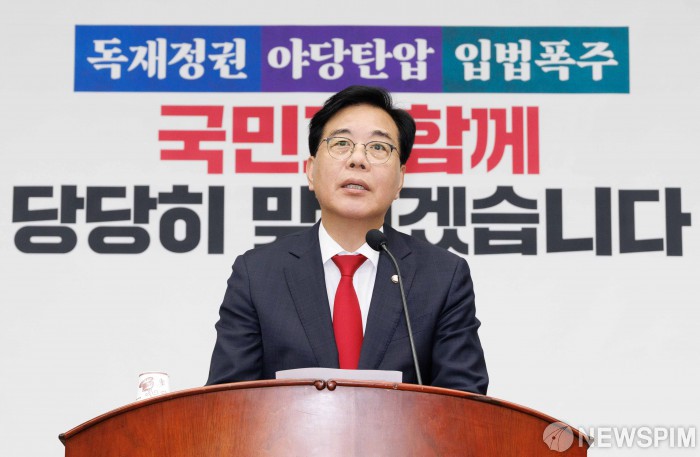 [서울=뉴스핌] 윤창빈 기자 = 송언석 국민의힘 원내대표가 8일 오후 서울 여의도 국회에서 열린 의원총회에서 모두발언을 하고 있다. 2025.09.08 pangbin@newspim.com