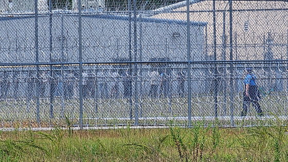 현지시간 6일 미국 조지아주 포크스턴에 위치한 불법 체류자 구금 시설에 수감된 한국인 근로자들이 추가 조사를 받기 위해 줄을 서서 이동하고 있다. 이들은 푸른색 죄수복 차림으로 손에는 서류를 들고 있었다. 이들 앞에 제복을 입은 시설 관계자가 근로자들을 통제하고 있는 모습니 보인다. 포크스턴=강태화 특파원 |